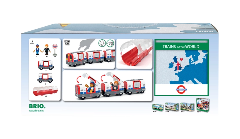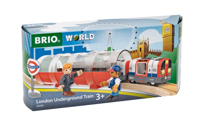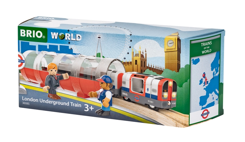 "Mind the gap", mens du hopper på 36085 London Metrotoget – som er en del af Trains of the World-serien. Metrotoget har det ikoniske design i røde, hvide og blå farver, og der medfølger en tunnel og to figurer. Skub toget for at aktivere dets lys og lyde og genskab oplevelsen af Londons undergrundsbane, som åbnede første gang i 1863. Oplev ikoniske togstrækninger og berømte tog fra hele verden med Trains of World-serien.