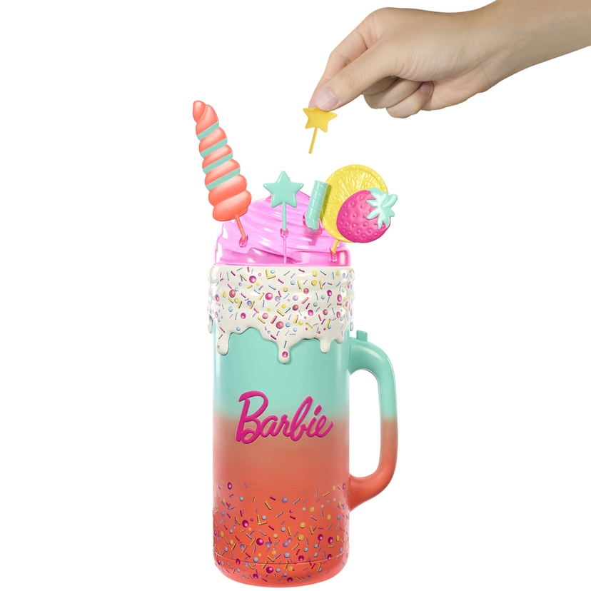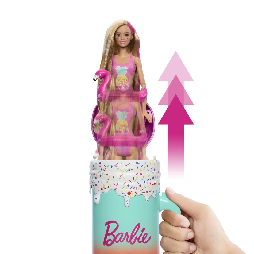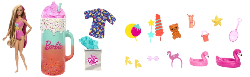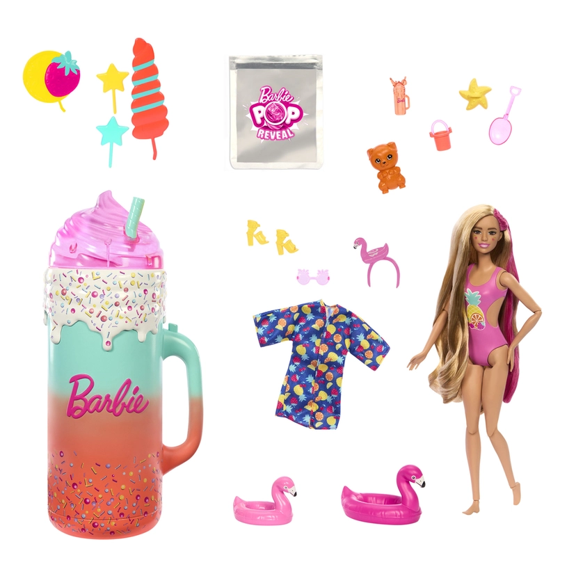 Med Barbie Pop Reveal Rise & Surprise-gavesættet med dukke og tilbehør popper legetiden virkelig. Pak 15 overraskelser ud, herunder en Barbie-dukke med duft og farveskiftende makeup, et blødt kæledyr med duft, formbart sand, modetøj og tilbehør til historiefortælling. Pak ud, tag koppens låg af, og tryk på knappen på håndtaget for at se Barbie-dukken stige til toppen gentag wow-øjeblikket igen og igen. Åbn isterningerne, og opdag overraskelser indeni. De kan genbruges, så du kan gentage den sjove leg. Mysterieposer indeholder ekstra tilbehør. De indeholder en strandskjorte med frugtprint, et par sko, baderinge, en pose med formbart sand og meget mere. Style Barbie til en sjov dag i solen, og skift hendes look med en farveskiftende funktion på hendes ansigt. Børn vil elske at opdage alle mulighederne for leg i dette gavesæt, der er spækket med overraskelser. Dukken kan ikke stå af sig selv. Farver og mønstre kan afvige fra det viste. Fra 3 år.