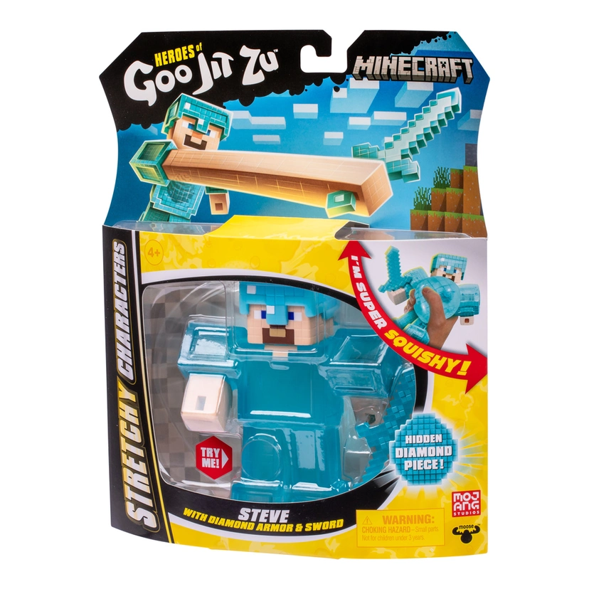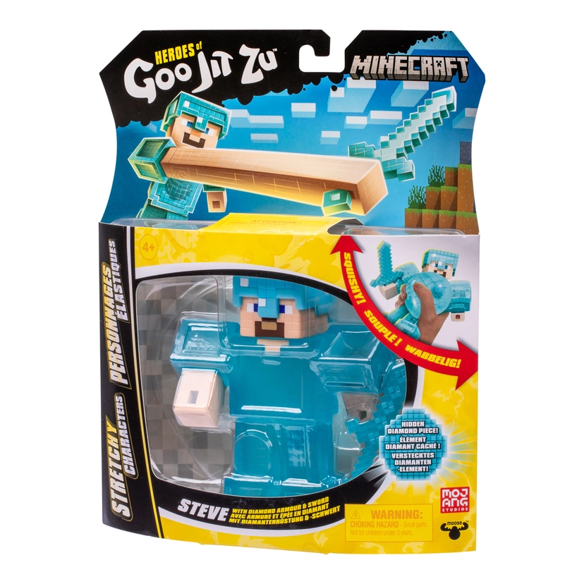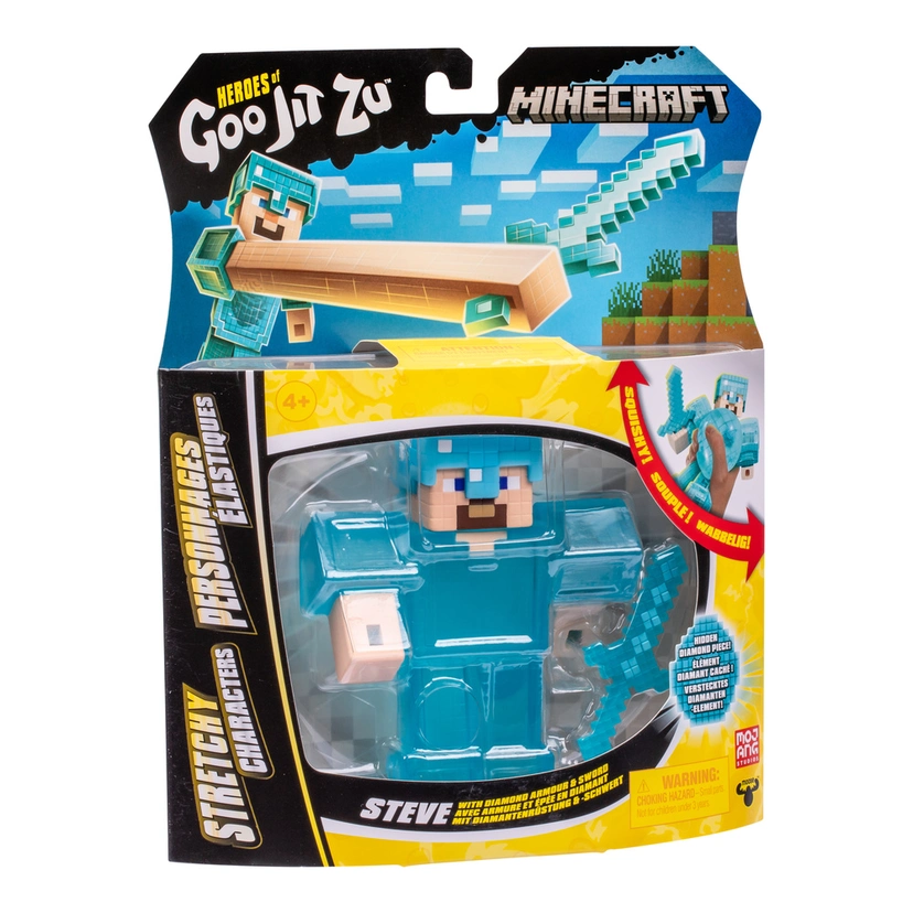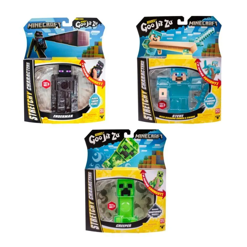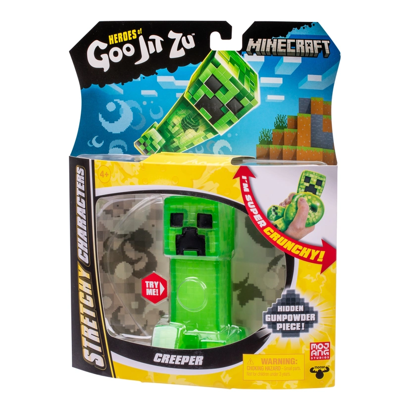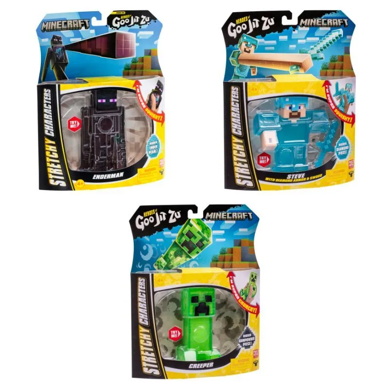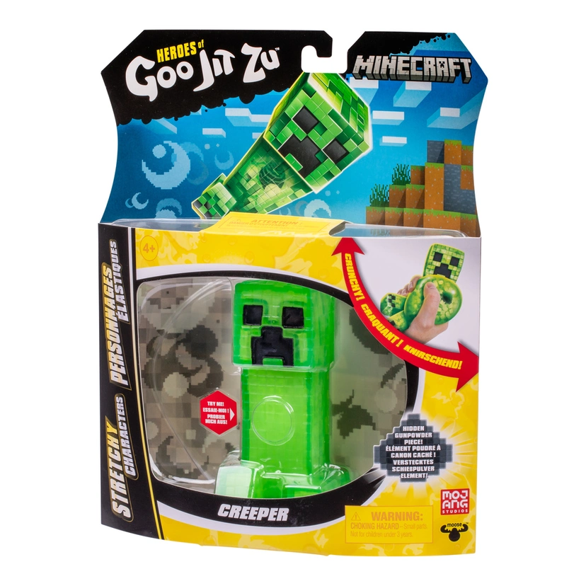 Gør dig klar til super strækbar action, når Heroes of Goo Jit Zu møder Minecraft! Tjek de strækbare karakterer Steve og Creeper ud. Steve har sin diamantrustning og sværd med en skjult "Diamant stykke" i sin goo-fyldning. Creeper har en skjult "Krudt støv". Hver figur har en unik goo-fyldning – Steve er superblød, og Creeper er supersprød! Stræk dem op til 3 gange deres størrelse. Med Heroes of Goo Jit Zu Minecraft vil du opdage en helt ny strækbare måde at lege på.