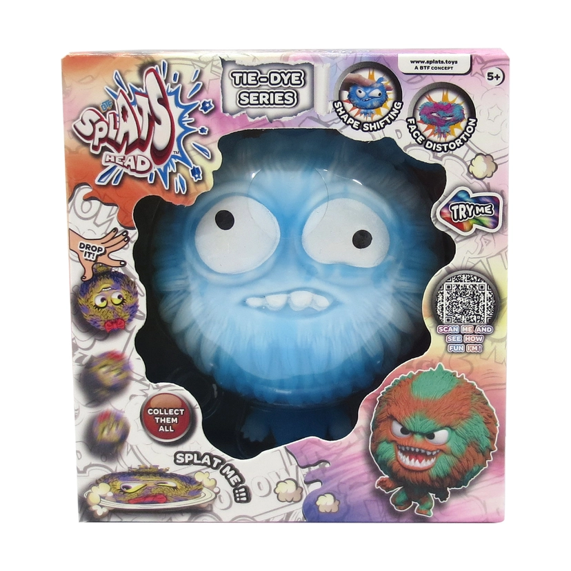 Spalts heads Tie Dye hoveder er vildt sjove og nubret! Lad hovedet falde til Jorden eller kast det på gulvet og se den nye fjollede ansigtsform på dit Splats Head. De skøre Tie Dye Splats Heads kan også formes eller trykkes til skøre udtryk. Det anbefales at hovedet kastes mod en glat overflade og ikke på gulvtæpper Tye Dye Splats Head indeholder sand. Vælg imellem 3 varianter. Cutsty, Blopsy el. Sharpy. Fra 5+ år