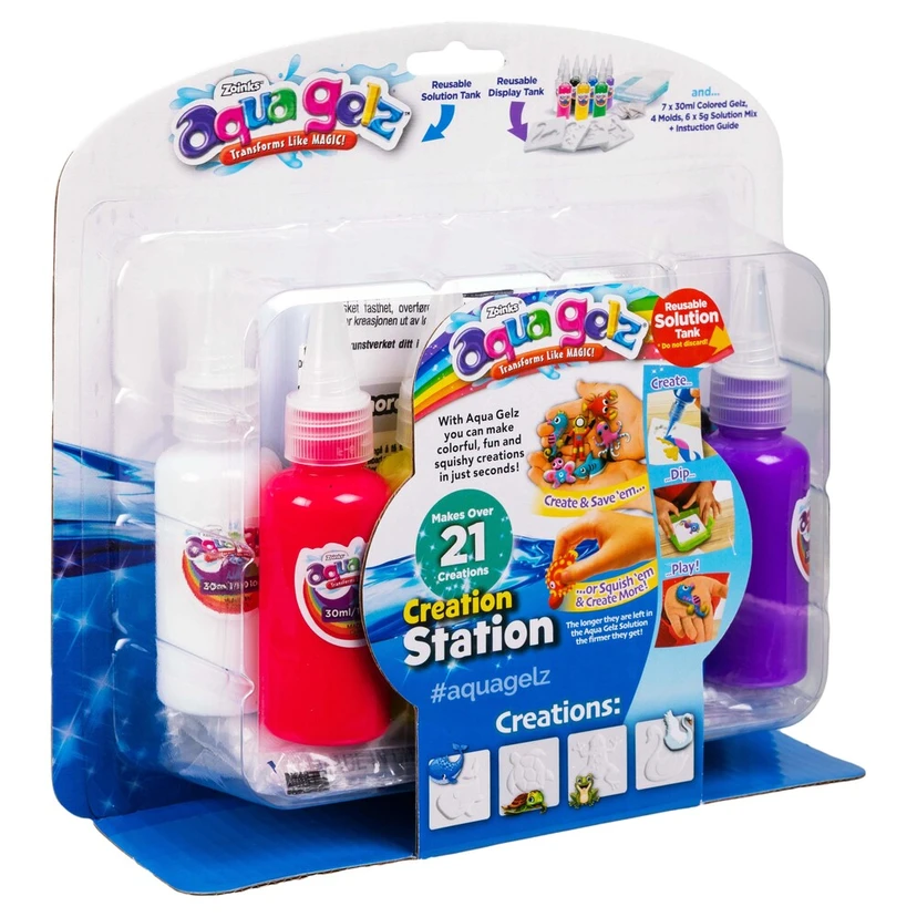 Aqua Gelz Core Creation er et magisk hobby-sæt med farvet gelé, der lader dig skabe sjove, farverige og bløde 3D-figurer! Hæld vand i Aqua Gelz-skålen, tilsæt en pose aktiveringspulver, og pres Aqua Gelz-farverne ud i en form. Læg formen i skålen med vandopløsningen, og se figuren forvandle sig til en 3D-form og løsne sig fra formen. Lad den hærde i opløsningen i yderligere 3-5 minutter. Når figurerne er færdige, kan du lege med dem. Opbevar figurerne i koldt vand for at holde dem bløde og fyldige. Indeholder: 7 x 30 ml Aqua Gelz-farver, 4 figurskabeloner, 4 x 5 g aktiveringspulver, vandbeholder, legebassin og instruktioner på dansk, svensk, finsk, norsk og engelsk. Fås i to forskellige sæt. Alder: 5+