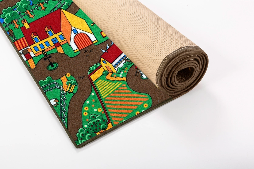Med en spændende kombination af marker, stier og gårdbygninger er tæppet ideelt til små eventyrere, der elsker at udforske bondegårdslivet. Det passer perfekt i børneværelset eller legerummet og skaber en hyggelig og legende atmosfære. Overfladen er lavet af polyamid, mens undersiden er skridsikker takket være latex, så tæppet ligger stabilt under leg. Det er nemt at rengøre med en støvsuger og en fugtig klud.