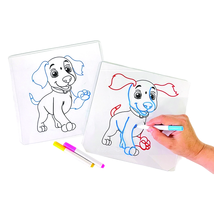 Brug de 4 medfølgende storyboards. tegn dine figurer på de to gennemsigtige plader og indsæt dem i basen – se lysene blinke og figurerne bevæge sig som ægte animation.