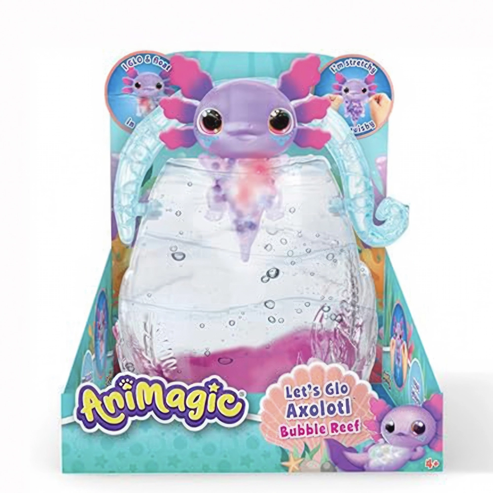 Naturligt Habitat: Animagic Let's Glo Axolotl Bubble Reef er din Let's Glo Axolotls drømmehjem! Boblesjov: Fyld Bubble Reef med vand, tryk på den magiske bobleknap og se, hvordan din Axolotl danser rundt i sit hyggelige akvariehjem. Hjertevarmende Sjov: Se, hvordan Axolotls hjerte lyser, når den er nedsænket i sit naturlige habitat.