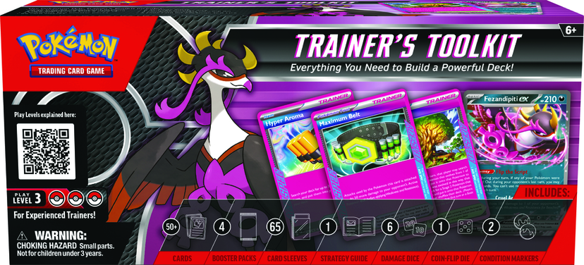 Det er alt, hvad du behøver for at bygge en stærk kortbunke! Forvandl din kortsamling til spilbare, sjove og konkurrencedygtige Pokémon Trading Card Game-decks med Trainer’s Toolkit. Inde i denne boks finder du et væld af Trainer-kort, inklusive ACE SPEC-kort, samt en strategiguide til at samle det hele og skabe et deck, der fremhæver dine bedste Pokémon!