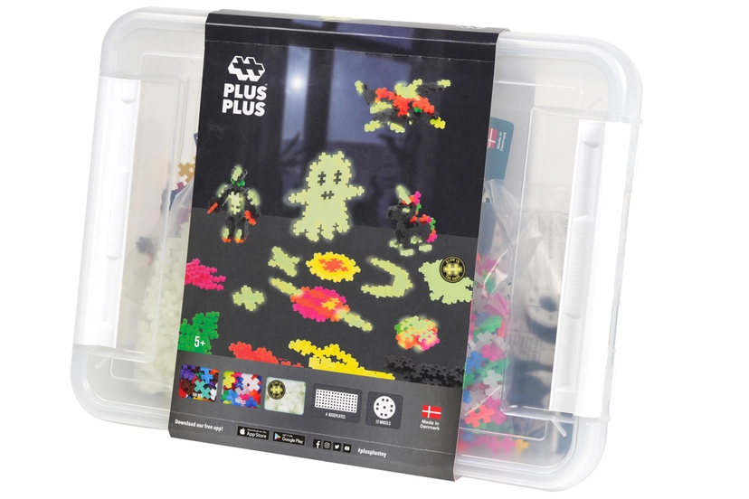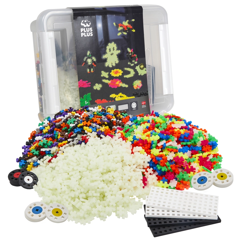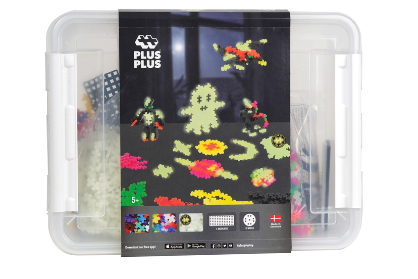 Denne boks indeholder alt, hvad man kan ønske sig for at komme godt i gang med at bygge med Plus-Plus. Indeholder selvlysende Plus-Plus, som lyser op i mørket.Samtidig får man en solid opbevaingsboks, som gør det nemt at have sine Plus-Plus samlet på ét sted. Boksen indeholder 2000 stk. Plus-Plus (600 stk. selvlysende, 700 stk. neon, 700 stk. basisfarve-mix, 4 små byggeplader, 12 stk. hjul), og en Learn-to-Build folder. Boksen måler 40 x 30 x 12 cm.