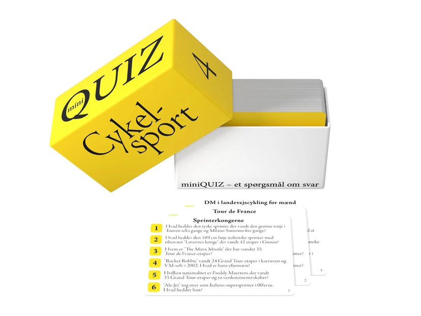 miniQUIZ er et enkelt quiz-koncept med hele 600 spørgsmål i et praktisk format, der er nemt at tage med på farten. Spillet kan spilles på mange forskellige måder, og i den gule udgave finder man 600 spørgsmål om cykelsport. Denne temaudgave er ud over at være quiz også en form for anekdotefortælling.