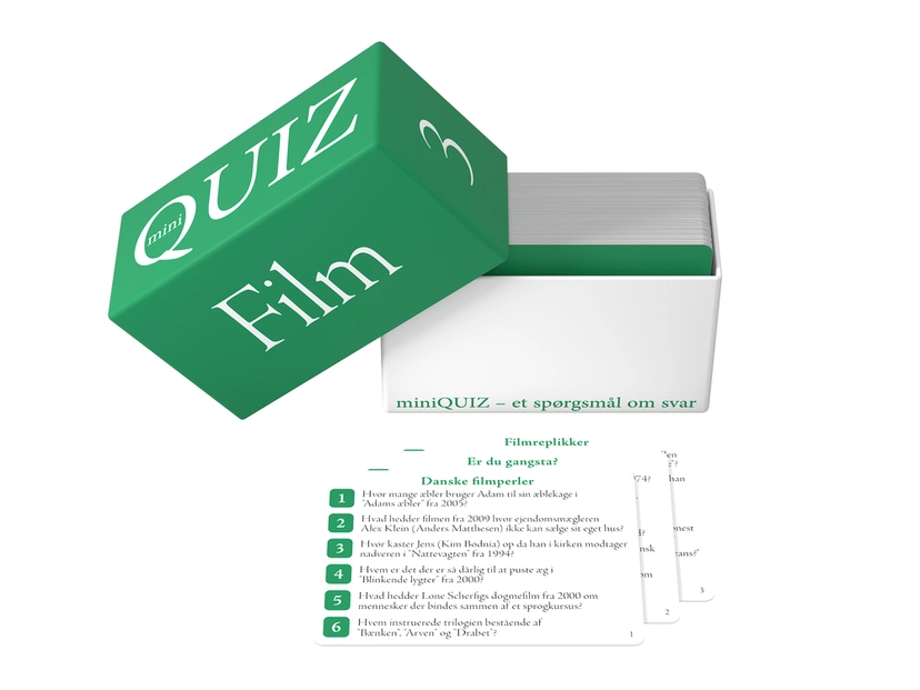 miniQUIZ er et enkelt quiz-koncept med hele 600 spørgsmål i et praktisk format, der er nemt at tage med på farten. Spillet kan spilles på mange forskellige måder, og i den grønne udgave hylder vi alle store, danske og udenlandske film med 600 spørgsmål fordelt på 100 kort med hvert sit tema, eksempelvis danske filmperler, Oscarvindere og filmcitater.