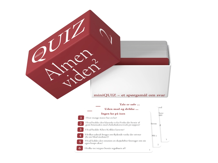 miniQUIZ er et enkelt quiz-koncept med hele 600 spørgsmål i et praktisk format, der er nemt at tage med på farten. Spillet kan spilles på mange forskellige måder, og i den røde udgave har hvert kort en overskrift i form af et udtryk, en talemåde eller et ordsprog som spørgsmålene associerer til. Med andre ord giver overskriften en ledetråd.