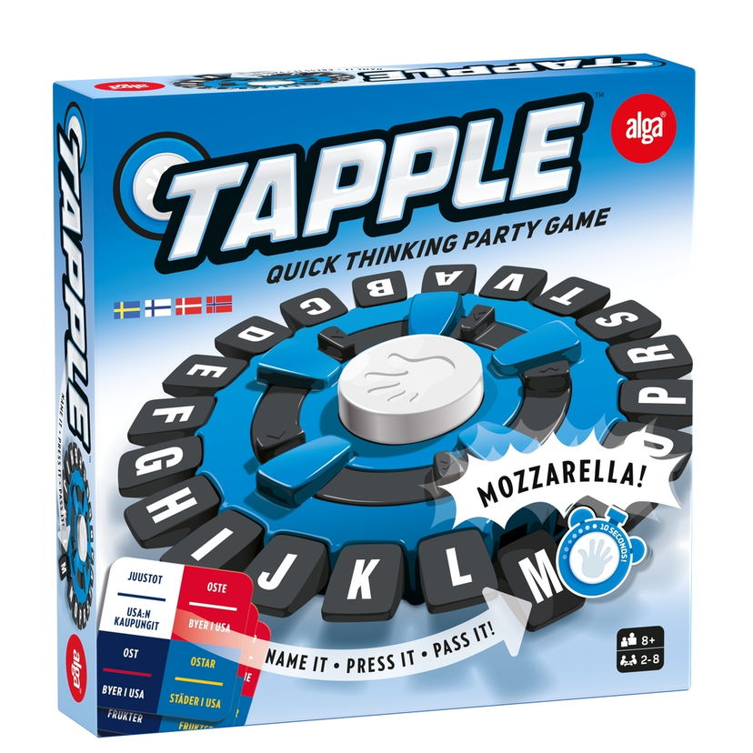 Populære Tapple erobrer verden! Med ultrakorte regler er Tapple spillet egnet til enhver lejlighed, hvor venner og familie er samlet. Tag et kort, og læs det ord højt, man skal konkurrere om f.eks. ost. Spilmodulet er selve spillet og timeren. Man skiftes til at trykke det første bogstav i forskellige oste ned, tiden går, og I har kun 10 sekunder. Det er ikke muligt at gentage det samme bogstav. Rigtig sjovt spil, hvor man skal tænke hurtigt! Modulet bruger 2 stk. AA-batterier (medfølger ikke). Fra 8 år. 2-8 spillere. Spilletid: 5-20 min.