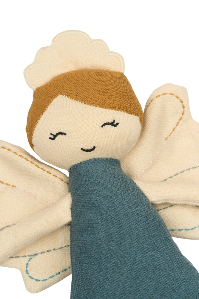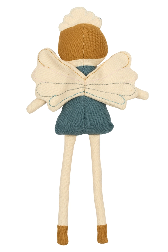 Dybt inde i hjertet af Eventyrlandet bor den blide fedukke, der flagrer gennem blomstermarker og spreder venlighed med hvert vingeslag. Hun tager sig af alle levende ting og elsker at dele sin magi, uanset hvor hun går. Med sin bløde krop og smukke detaljer er hun den perfekte ledsager for små drømmere – klar til at ledsage dit barn på ethvert eventyr, stort som lille. Aldersanbefaling: 0m+