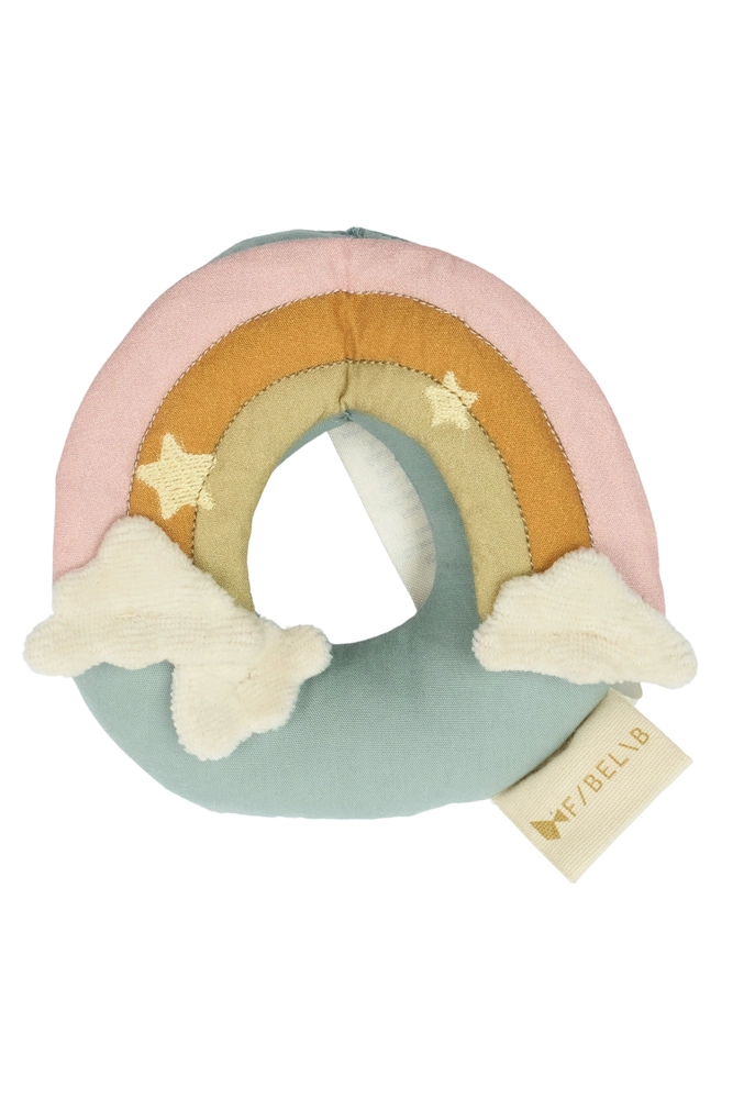 Rattle – Rainbow er nem for små hænder at holde og gribe fat i. Det vævede bomuldsstof giver en blød, taktil overflade, der opfordrer din baby til at udforske forskellige sanseindtryk, mens de griber fat i og ryster ranglen.