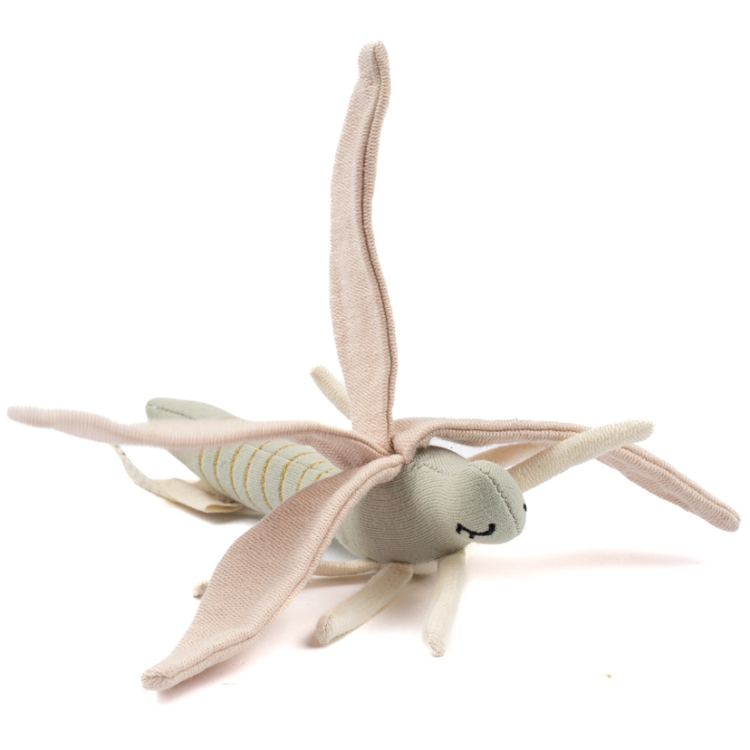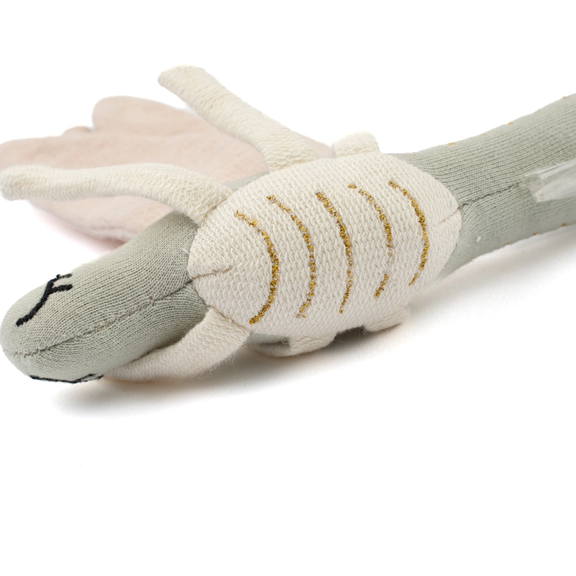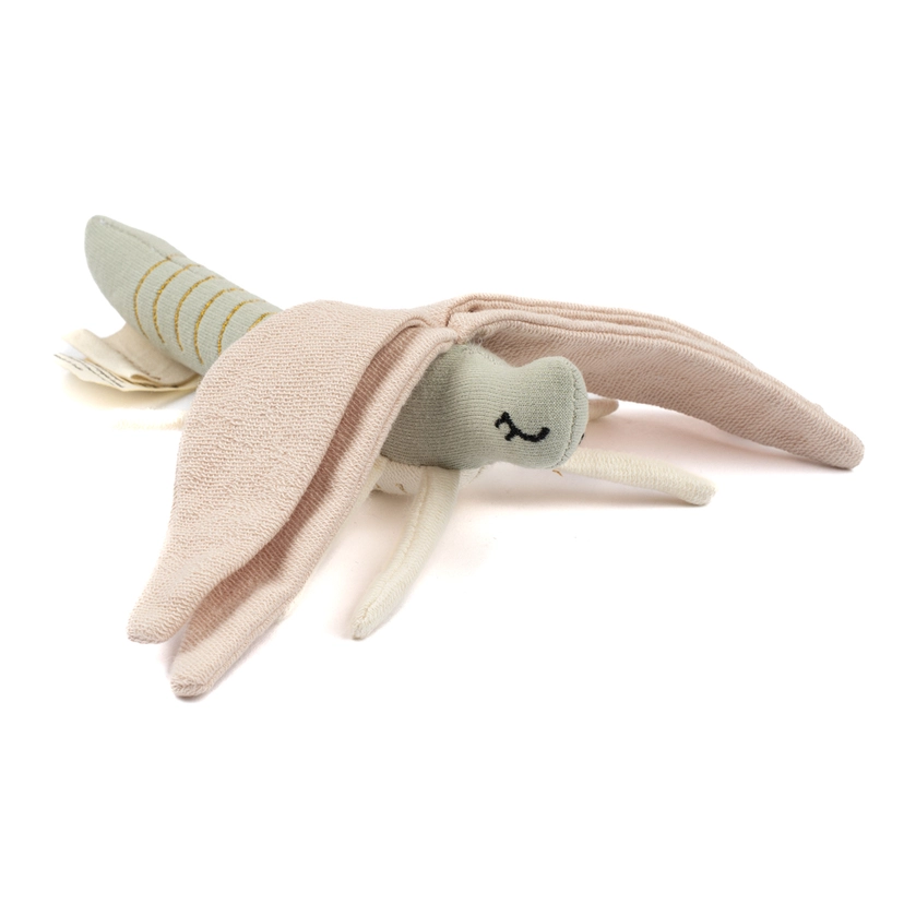 Guldsmeden er formet som en blød rangle med lange, kradsende vinger og gyldne sting og er designet til at underholde og stimulere din babys sanser gennem dens ivrige hænder, ører og sind.