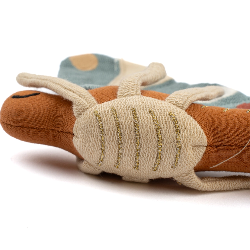 Vi præsenterer raslesommerfuglen - et dejligt legetøj designet til at fange og underholde din lille guldklump. Denne sommerfuglerangle er lavet af blød, økologisk bomuld og er både skånsom mod din bab...