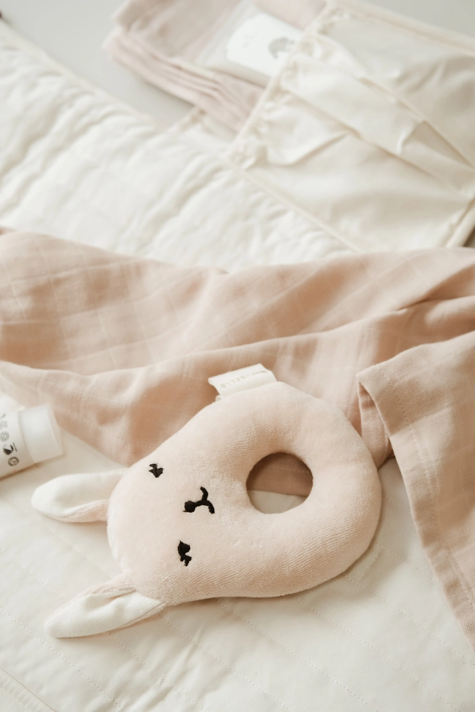 Rangle - Kanin - nem for små hænder at holde og gribe fat i. Det økologiske velourstof giver en blød og taktil tekstur, der giver din baby mulighed for at udforske forskellige sanseindtryk, mens de gr...
