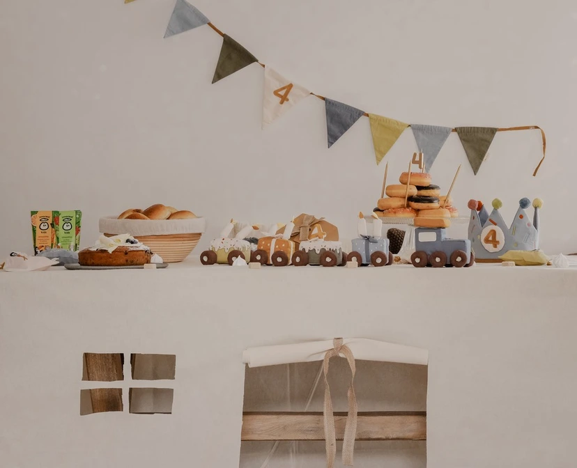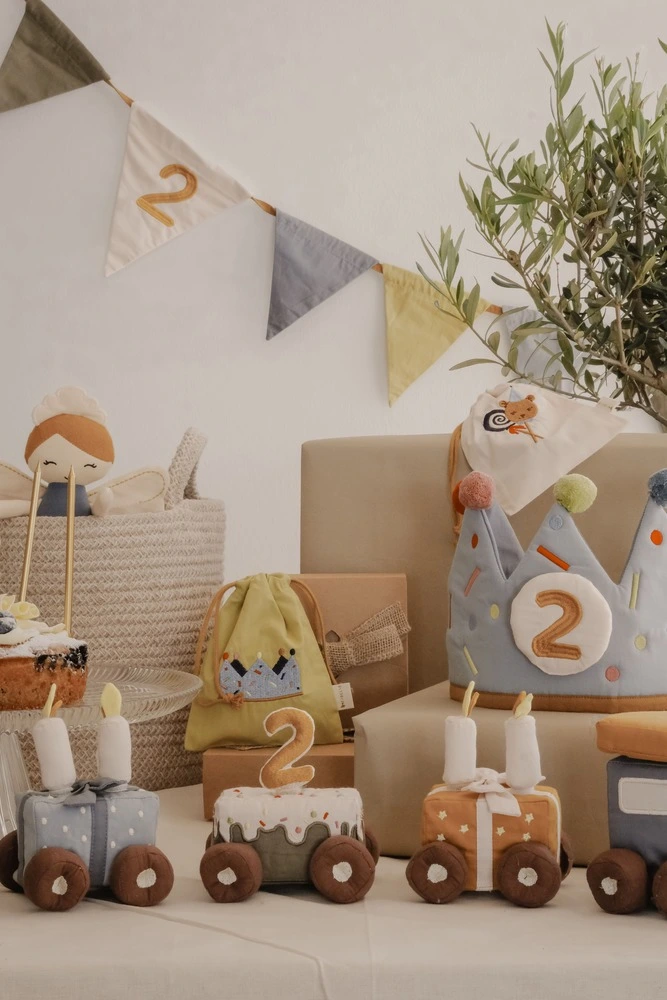 Fabelabs Guirlande – Celebration Blue Mix er en legende stofguirlande i bløde blå, grønne og cremefarvede toner. Den har otte flag og inkluderer et udskifteligt talflag (1-9), så du kan personliggøre den til fødselsdage år efter år.